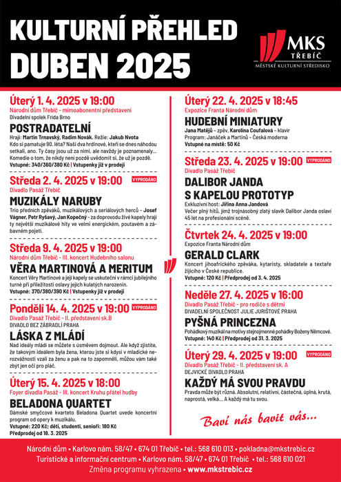 Úvod > Život v obci > Aktuality > MKS Třebíč - kulturní přehled duben 2025