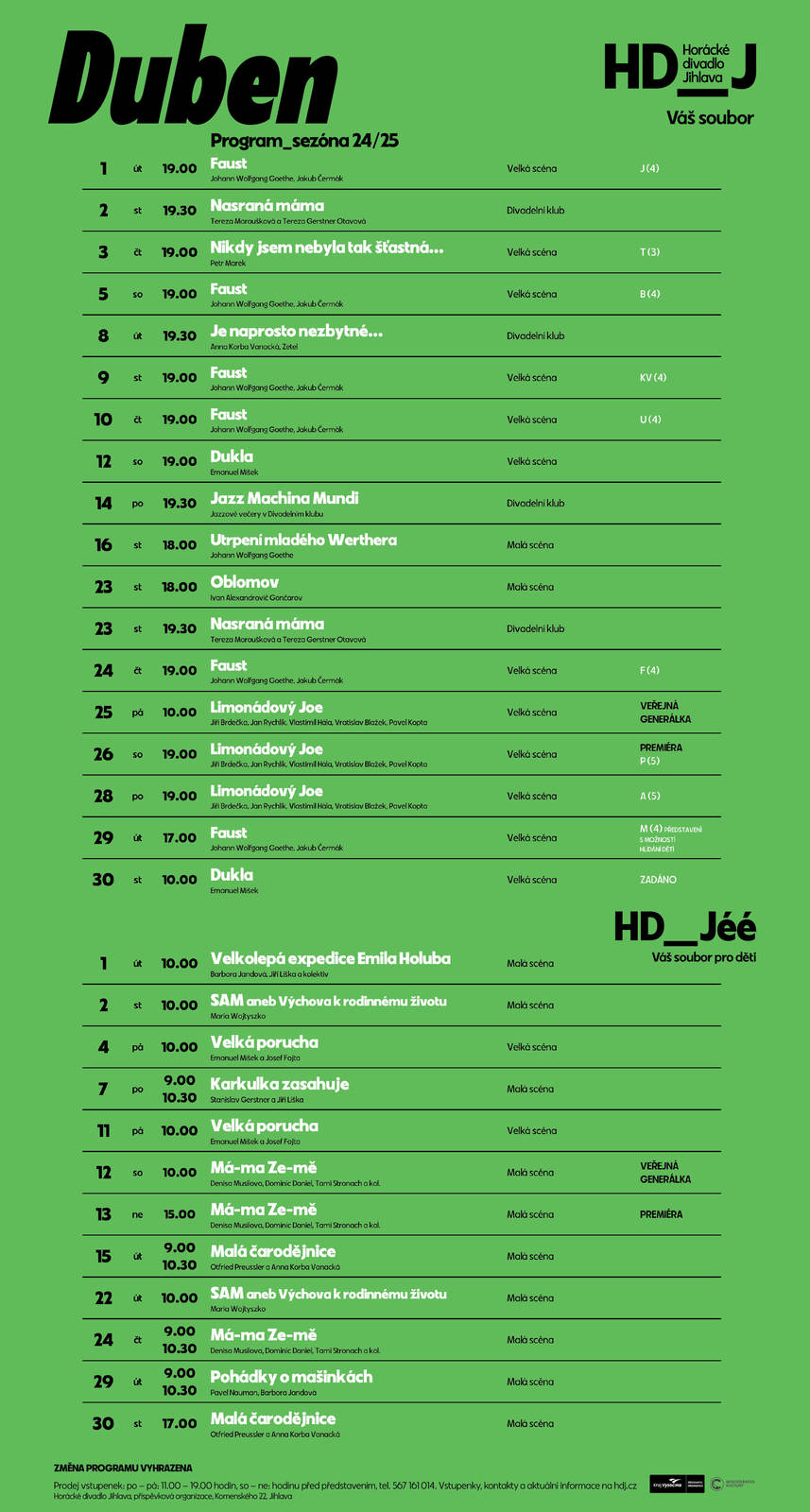 Úvod > Život v obci > Aktuality > Program Horáckého divadla Jihlava - duben 2025