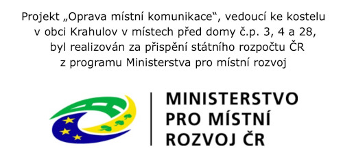 Projekt Oprava místní komunikace vedoucí ke kostelu v obci Krahulov v místech před domy č. p. 3, 4 a 28 byl realizován za přispění státního rozpočtu České republiky z programu Ministerstva pro místní rozvoj.